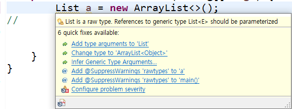 이런 raw type (파라미터가 없는 제네릭 타입)이며 타입을 지정하라는 경고가 뜬다.