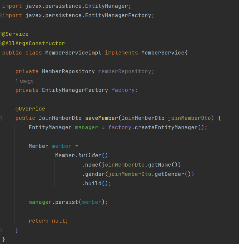-- return null은 나중에 할거라 일단 null 처리 했다.--