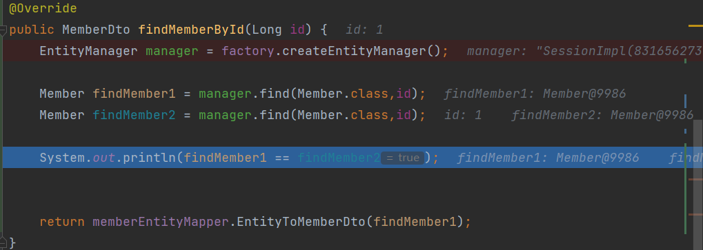 Debug 모드로 찍어본 결과 findMember1과 2는 Member@9986을 바라보고 있기 때문에 true가 된다.