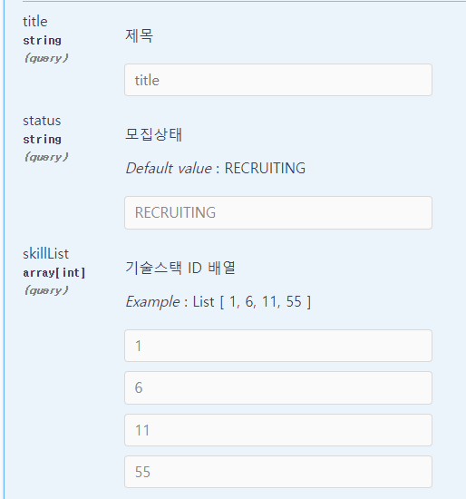 때문에 PostSearchCondition은 파라미터 객체이기 때문에 @ParameterObject를 사용하는 게 맞다고 생각했다. 실제로도 skillList를 제외한 부분들에 대해서는 적용이 되는 것을 확인할 수가 있고.