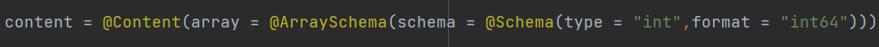 @Parameter(description = "기술스택 ID 배열", example = "[1, 6, 11, 55]", content = @Content(array = @ArraySchema(schema = @Schema(type = "int",format = "int64"))))