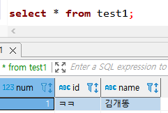 test1에 있는 모든 데이터를 select 문으로 조회해 보면 위와 같이 1, ㅋㅋ, 김개똥