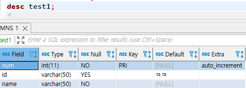 실제적으로 test1의 칼럼은 num id name으로 3개였는데, select 구문에서 2개를 선택해 2개만 가져오게 되었다.