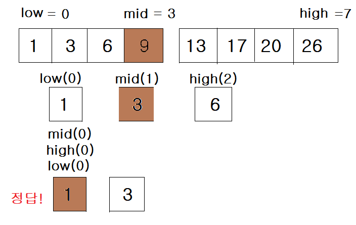 - 찾으려는 값인 1은 9보다 왼쪽에 있기 때문에 high를 앞으로 당겨줘야 한다.