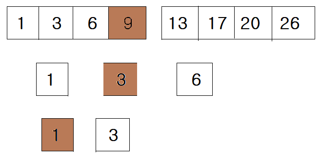 - 1이 가운데의 원소인 9보다 작으면 왼쪽 배열을 선택한다.
