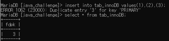MyISAM에서는 위의 에러처럼 3이 있기 때문에 3을 제외한 모든 insert문이 실행되었다.