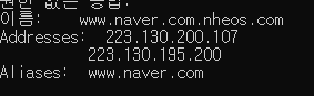 DNS는 Domain Name System으로 호스트의 도메인 이름을 호스트의 네트워크 주소(IP)로 바꾸거나, 그 반대로 변환할 수 있도록 하기 위해 개발됐다. 쉽게 말해서 IP는 기억하기 어려워서 DNS가 나왔다. 예를 들어 네이버는 우리가 다 알 듯이 www.naver.com이다. 아래 이미지 처럼 223.130.200.107 이라고 네이버의 주소를 기억하는 사람은 없을것이다. DNS는 DNS 서버에 도메인을 등록하면 등록한 사이트의 IP의 값을 같이 갖고 있는다. 순서는 다음과 같다. 클라이언트가 naver의 주소를 입력한다. DNS 서버는 naver의 ip 주소를 응답한다. naver의 ip 주소로 접속을 시도한다. ...너무 간단..하다 끝...